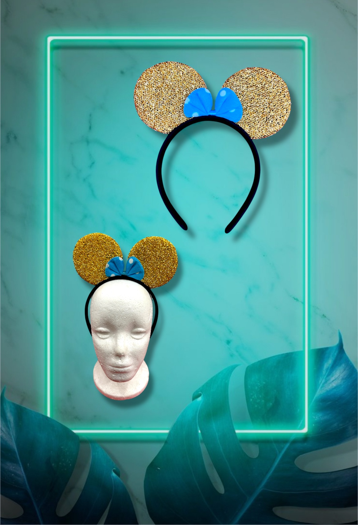 Vincha con brillos, orejas de Minnie y moño. Accesorio brillante para fiestas temáticas y disfraces.